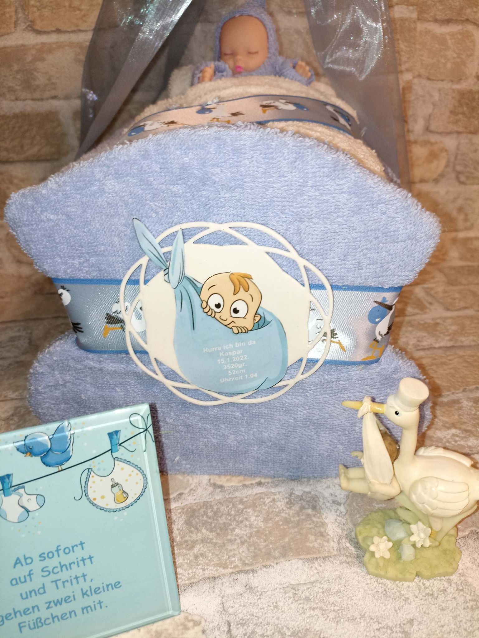 Sie suchen nach einem besonderen Geschenk zur Geburt?Mit dieser Zauberhaften Wiege haben sie genau das Richige gefunden.Der Rohling für die Wiege,ist von Handgemacht,und mit hellblauen Frottestoff überzogen.Der Himmel ist aus einem Organzastoff in der Farbe hellblau,in der Mitte mit einer Schleife verziert.Die Bestestigung Vorrichtung angefertigt,und befindet sich fest an der Wiege.Als Kissen ist weißes Gästehandtuch und einen weißen Handwaschlappen verwendet worden.Das große Kissen mit dem die kleine Puppe bedeckt ist,besteht aus einem weißen Handtuch 50x100 cm.Dieses ist mit einem Geschenkband eingefasst.Rundum ist die Wiege mit einem Motiv Geschenkband eingefasst (wie abgebildet).An dem Vordereteil der Wiege,ist ein Logo angebracht mit Name,Datum,Uhrzeit und Größe.Bitte vergessen Sie nicht dieses bei Ihrer Bestellung anzugeben.....