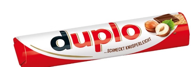 Duplo Zutaten: Vollmilchschokolade 49,5% (Zucker, Kakaobutter, Vollmilchpulver, Kakaomasse, Emulgatoren Lecithine (Soja), Vanillin), Zucker, pflanzliche Fette, Weizenmehl, Haselnüsse (5,5%), fettarmer Kakao, Süßmolkenpulver, Emulgatoren Lecithine (Soja), eiweißangereichertes Molkenpulver, Weizenstärke, Salz