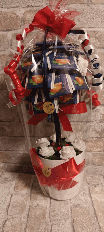 Ein besondere Geschenkidee für alle Teeliebhaber.Dieser Teebaum hat eine Größe 30 cm.Die Teebeutel sind zu einer Kugel geformt und lassen sich leicht ablösen.Bestückt mit vielen weißen kleinen Moosröschen als Dekoration.Der Blumentopf ist aus Kunststoff und mit grünen künstlichem Gras und weitere Moosröschen verziert.Zwei große rote Schleifen machen diesen Baum zu etwas besonderem.