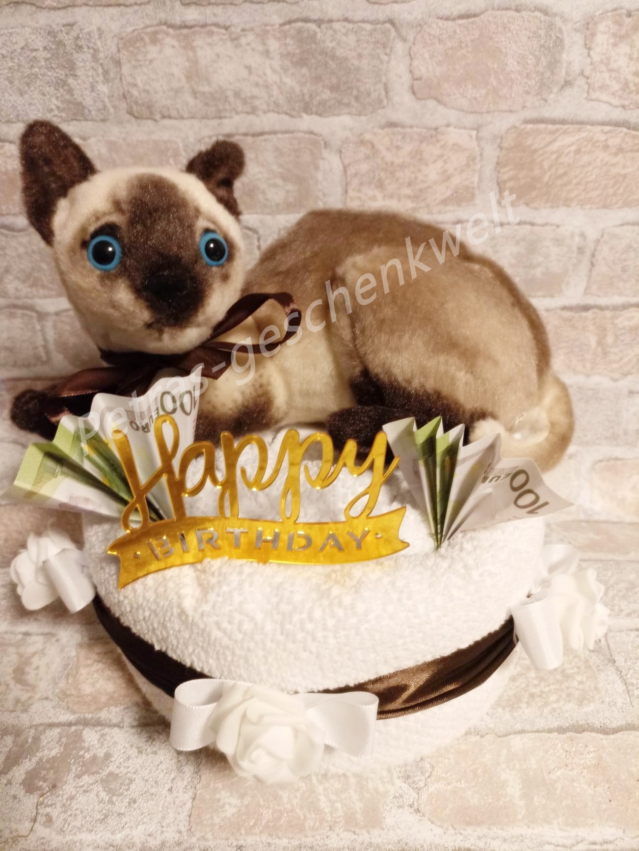 Originelles Geburtstags Geschenk für alle Katzenliebhaber.Aus einem weißen Duschhandtuch zu einer runden Torte geformt..Als Dekoation 1 x Einfassung Geschenkband Geschenkband Satin braun,4 Schleifen mit jeweils einer weißen Schaumrose,1 Stecker Happy Birthday gold Optik,eine Katze....