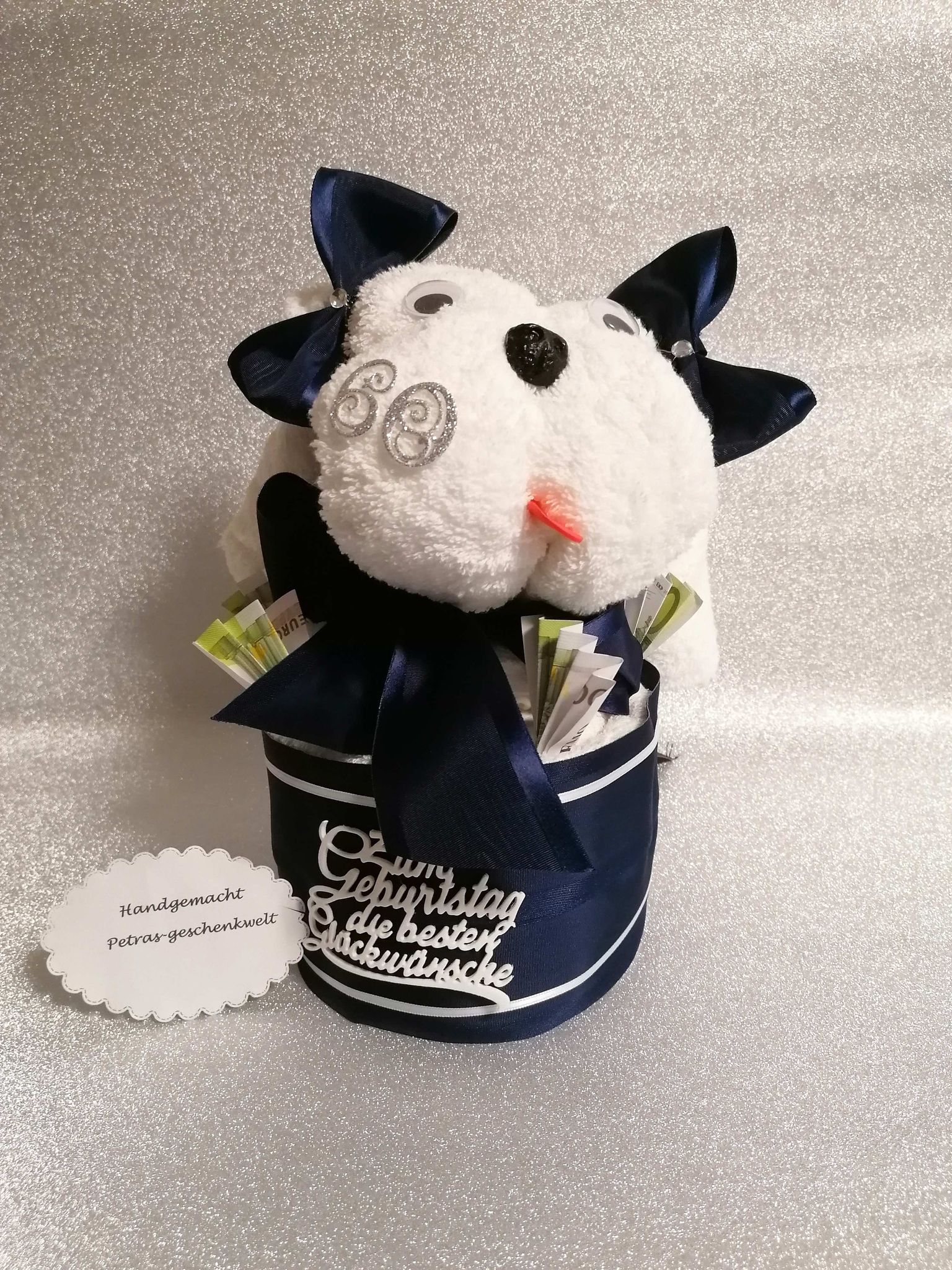 Ein hübsches Geschenk zum 60.Geburtstag in Form einer Handtuchtorte mit einem weißen Handtuch Hund.Die Handtuchtorte ist aus einem weißen Handtuch gebunden,und mit breiten blauen hochwertigem Geschenkband eingefasst.Eine sehr schöne Geschenkidee für jedermann.