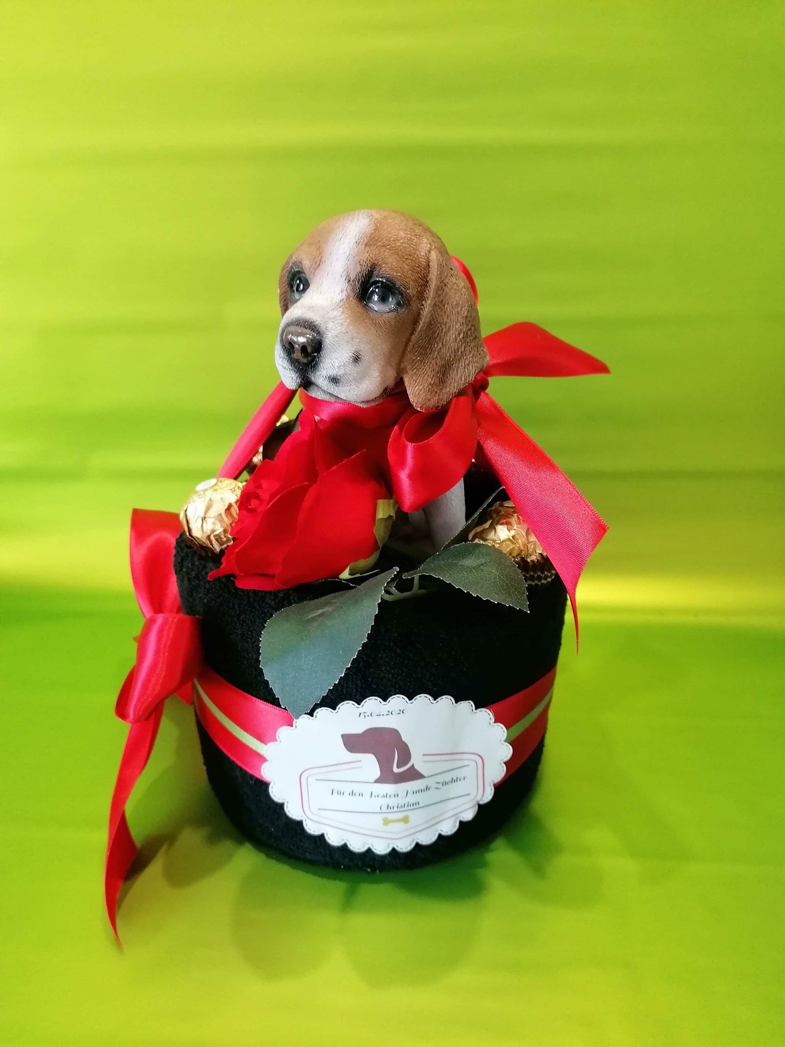 Sie suchen nach einer besonderen Geschenkidee zum Geburtstag für einen Hobby Züchter?An einen Blumestrauß haben Sie eigentlich nicht gedacht?Mit dieser Handtuchtorte mit einer Hundefigur als Geschenk,haben Sie sicherlich das richtige Auswahl gefunden.Auf einen besonderen Wunschtext brauchen Sie nicht verzichten.