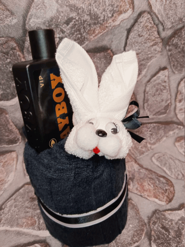 Sie suchen nach einem Ausgefallenen Geschenk für Ostern für einen Herren.Mit diesem Geschenk können Sie jedem ein lächeln ins Gesicht zaubern.Für die Herstellung dieser Handtuchtorte wurden ein Schwarzes Handtuch,ein Gästehandtuch verwendet.Der Osterhase besteht aus einem weißen Gästehandtuch.Für den Herrn hat er ein Geschenk mit dabei 1 Deospray dieser Duft ist bei Herren sehr beliebt.