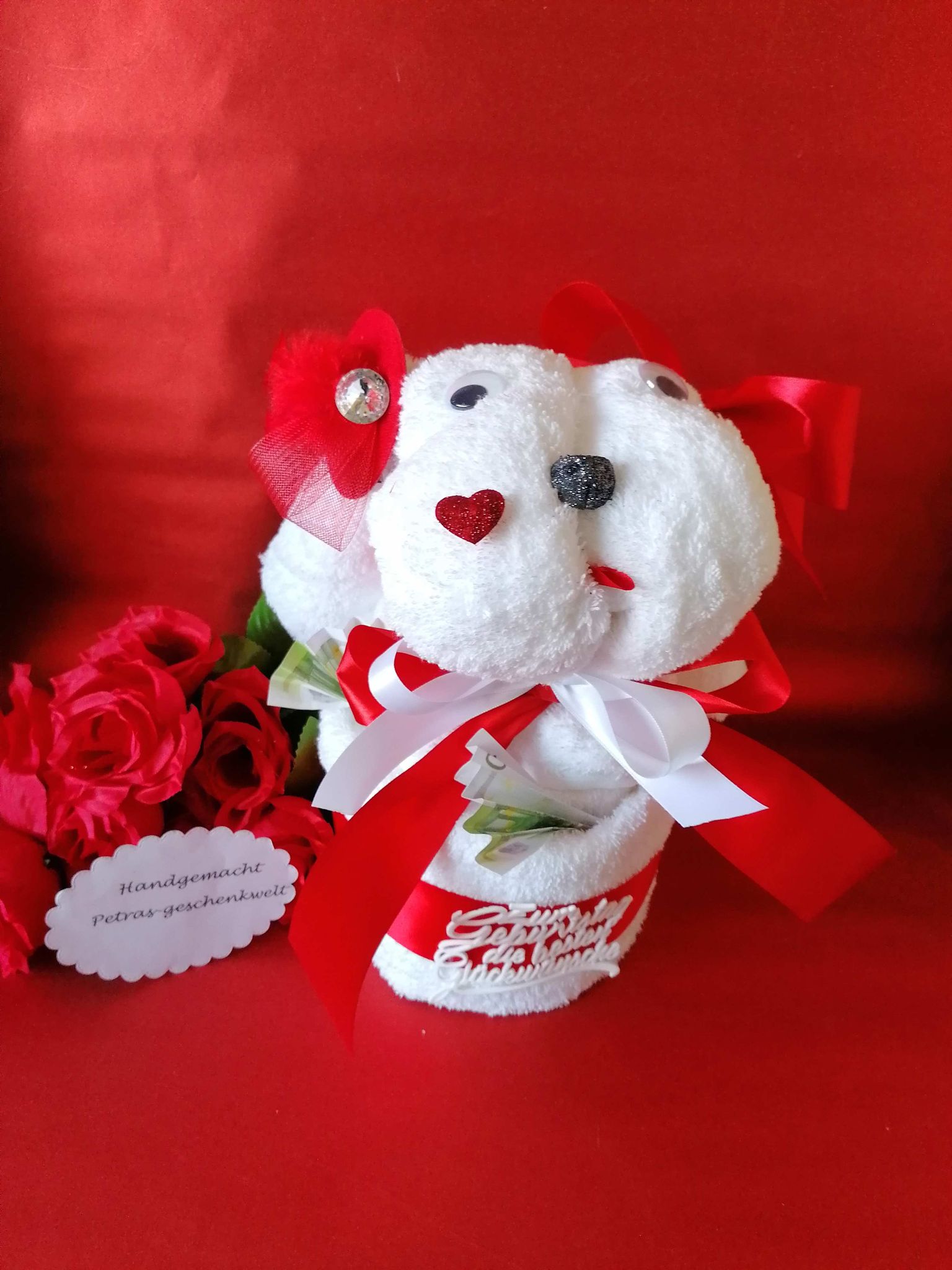 Sie suchen nach einer besonderen Geschenkidee zum Geburtstag als Geldgeschenk.Mit dieser Handtuchtorte,haben Sie sicherlich das richtige gefunden.Sie können diese Handtuchtorte noch zusätzlich mit Geldscheinen bestücken.Der große Handtuch Hund besteht aus einem weißen Duschhandtuch,seine Ohren aus 2 weißen Handwaschlappen.Er sitzt auf auf weißem Duschhandtuch,weiß geformt zu einer runden Torte.Diese mit mit einem roten Satin Geschenkband verbunden,und mit verziert.