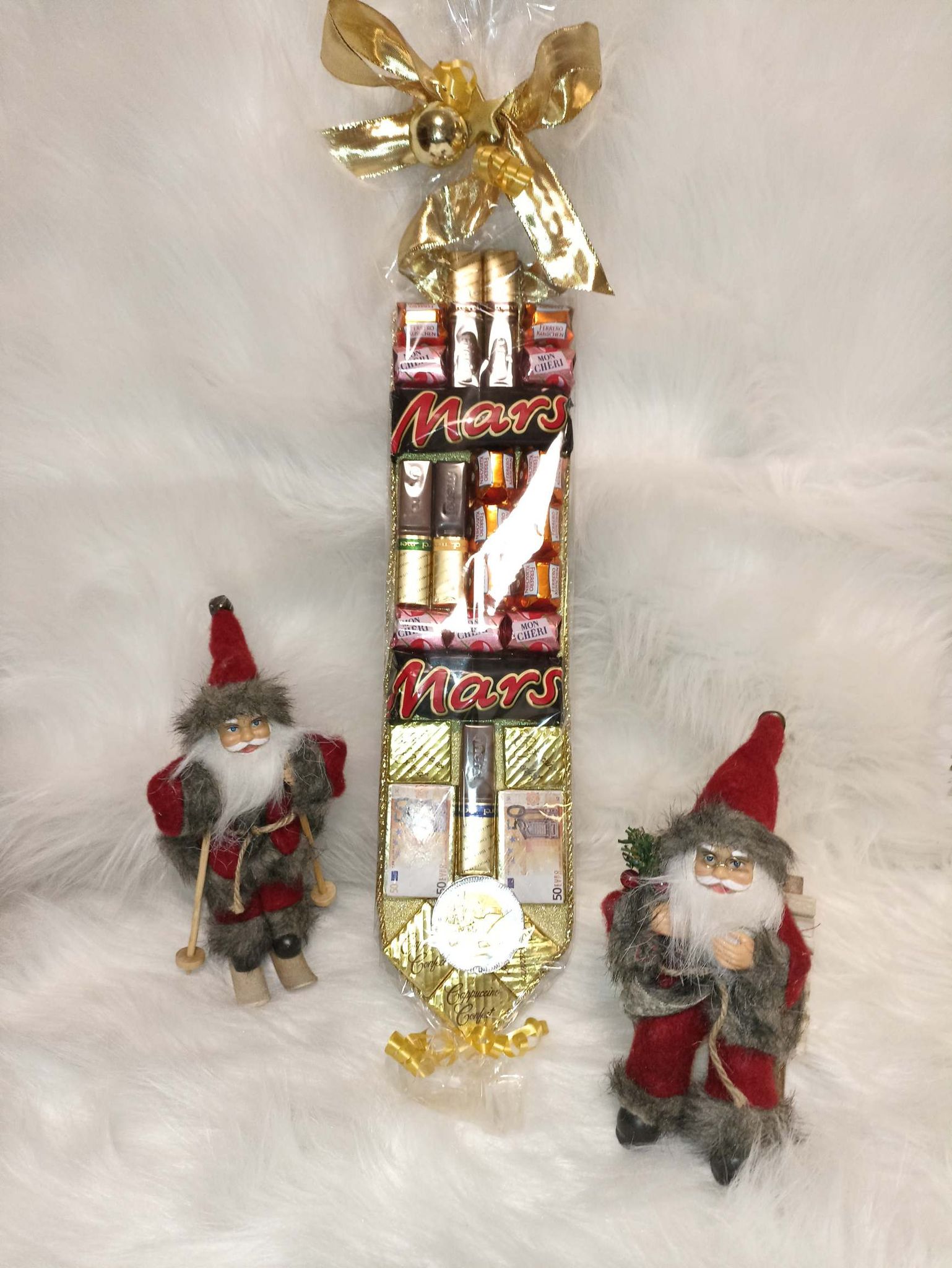 Immer noch auf der Suche nach einem Orginellen Geschenk für einen Herren? In unseren Sortiment Petras-geschenkwelt werden Sie garantiert fündig.Ideal für als Weihnachtsgeschenk&Nikolaus oder ein kleines Mitbringels,ist dieses Geschenk Willkommen.Mit diesem Handgemachten Geschenk als Krawatte verzaubern Sie jedem Beschenkten ein Lächeln ins Gesicht.Sie ist mit verschiedenen Leckerein bestückt,die alle vernascht werden dürfen.Eingefasst die Pralinen Krawatte mit einer goldenen Kordel.Mit diesem Geschenk hast Du für eine wahrliche Überraschung.