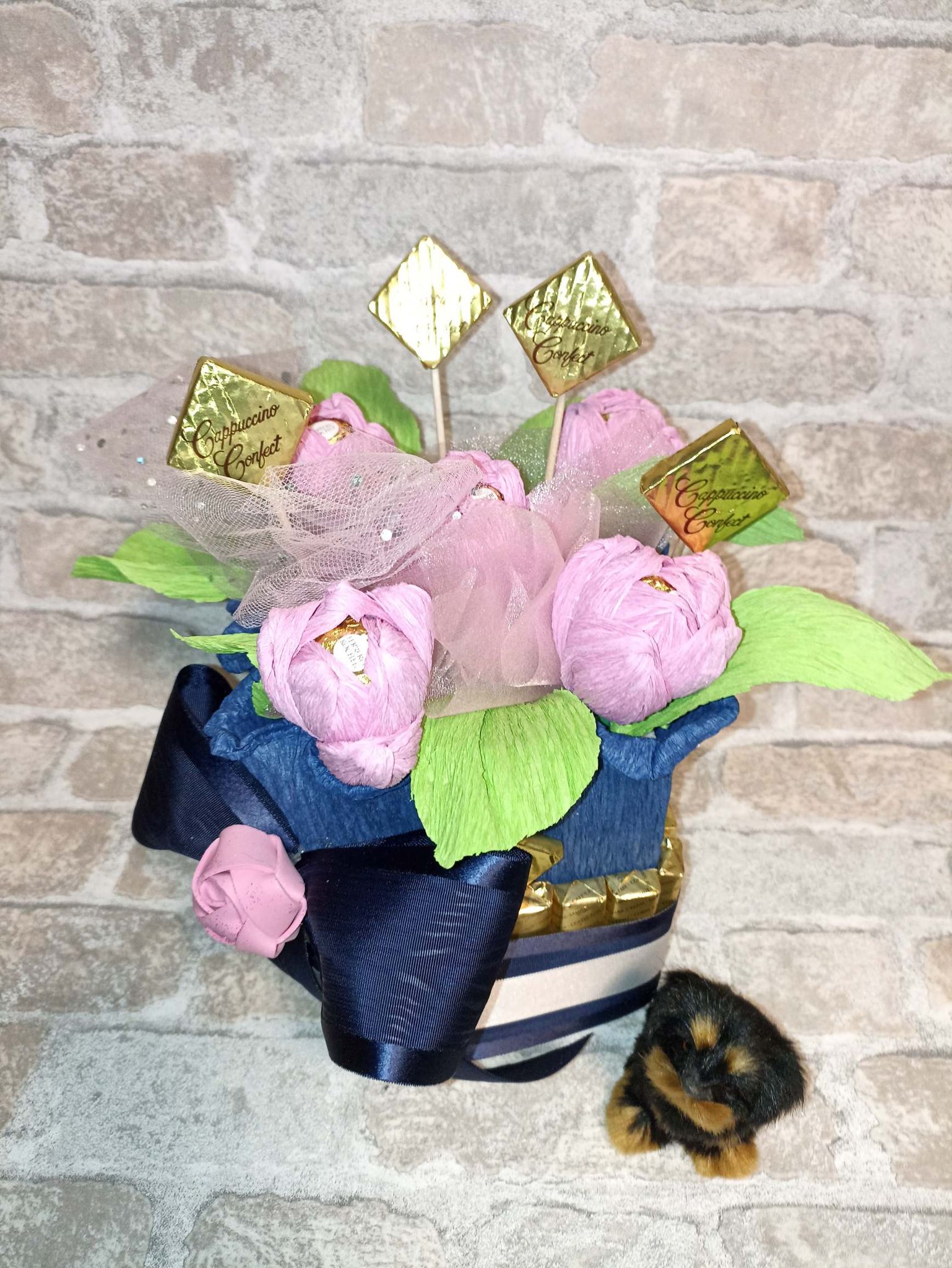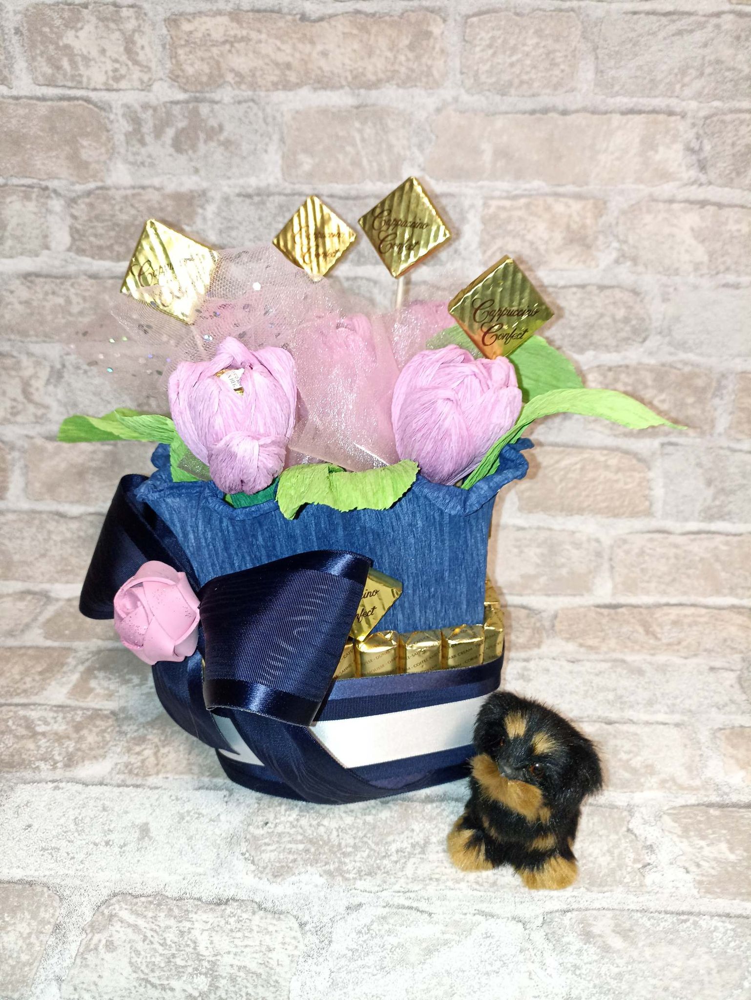 Vielleicht haben Sie haben noch kein Passendes Geschenk gefunden zum Muttertag oder vielleicht Geburtstag oder weiteren Anlässen,und sind auf der Suche nach etwas Originellen zum verschenken?An einen Blumenstrauß haben Sie jedoch nicht gedacht,sondern etwas besonders sollte es sein?Mit diesem Zauberhaften Pralinenkorb,dessen 5 Krokussblüten mit jeweils eine Praline gefüllt ist,der in liebervoller Handarbeit gebunden wurde und mit Verzierungen bestückt ist.Zwischen den Pralinenblüten wurden 4 Schokoladen Tafeln mit eingearbeitet. mit 26 Merc.Tafen rundum bestückt,und mit einem breiten edelen Geschenkband und weißen Geschenkband eingefasst.Verziert seitlich mit einer großen blauen Schleife mit 1 rosa Schaumrose.