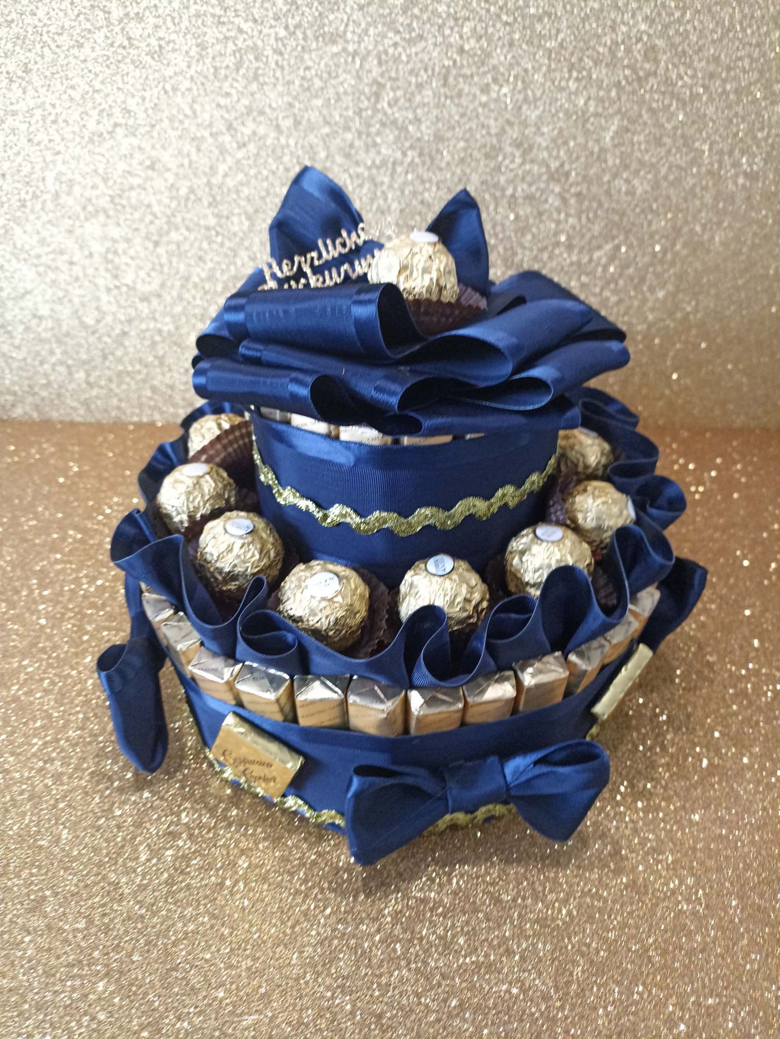 immer noch auf der Suche nach einem Orginellen Geburtstag Geschenk,?Mit diesem Handgemachten Geschenk zaubern Sie jedem Beschenkten ein Lächeln ins Gesicht.Es ist nicht nur elegant,sondern auch ein richtiger Blickfang!Diese zwei Runden Rohlinge sind mit 55 M.Pralinen rundum bestückt,und mit einem hochwertigen Geschenkband blau eingefasst.Verzierungen 5 hochwertige Schleifen blau,1Logo in Glitzer gold Herzlichen Glückwunsch.Die Blume ist aus blauen Geschenkband angefertigt.