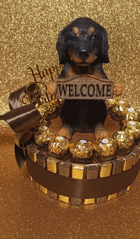 Blumen sind heutzutage zwar immer eine große Freude ,Überrasche doch mal mit einem ausgefallenen Geschenk für einen Hundeliebhaber, mit einem nicht alltäglichen Geschenk einen besonderen Menschen,sondern mit dieser Pralinentorte.An einen Blumenstrauß haben Sie jedoch nicht gedacht,sondern etwas besonders sollte es sein?Diese Zauberhafte Pralinentorte ist rundum bestückt mit 31 Merc.Pralinen,und mit einem braunen Satinband und einer Schleife eingefasst auf der Torte sitzt ein Hund kann auch als Dekoration verwendet werden.Rundum ist das Hunde Pärchen mit 16 Roch.Pralinen verziert.Ein Schild in Gold Optik Happy Birthday verleiht dieser Pralinentorten den letzten Fleer.....