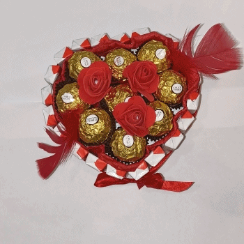 Pralinen Herz.Dieses von Handgemachte Herz ist geflüllt mit 9 Roch. Pralinen,und rundum ist sie mit 20 Schokoriegel. Schleife.Eingefasst ist diese wunderschöne Pralinen Herztorte mit einem roten Geschenkband und einer Schleife.