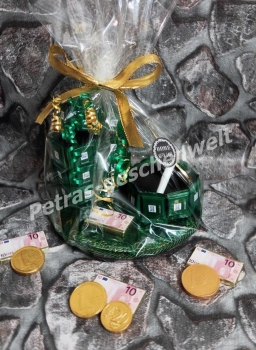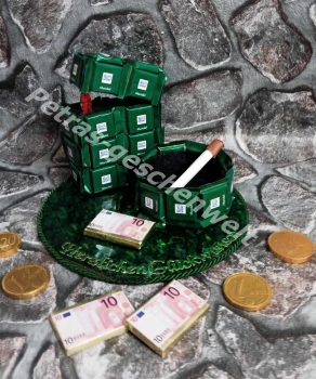Der Aschenbecher ist aus Schokoladen Mandeln Tafeln hergestellt,und mit einer grnen Kordel rundum eingefasst.Das Feuerzeug aus 33 Schokoladen Mandeln Tafeln angefertigt,sodass es die Form eines Feuerzeug ähnlich sieht..Zum vernaschen eigentlich viel zu Schade.Beides steht auf einem runden Sockel dieser ist mit grünem glitzer Neon Papier überzogen Als weitere Leckereien wurde vereinzelt 1 Schokoladen Geldschein und Scholoaden Geldstücke verziert.Die Zigarette wurde aus weißen und braunen Ton Papier angefertigt.Ein Ausgefallenes Geschenk für Ihren Chef oder Chefin...einfach nur Genial